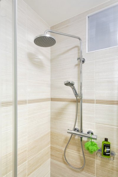 Nous avons équipé cette cabine de douche d'une bonde de sol en inox qui fait ressortir la beauté des carrelages en céramique et qui garantit également un excellent écoulement de l'eau. Lorsqu'elle se douche, la famille Langer peut utiliser un pommeau de douche de tête ou une douchette à main.